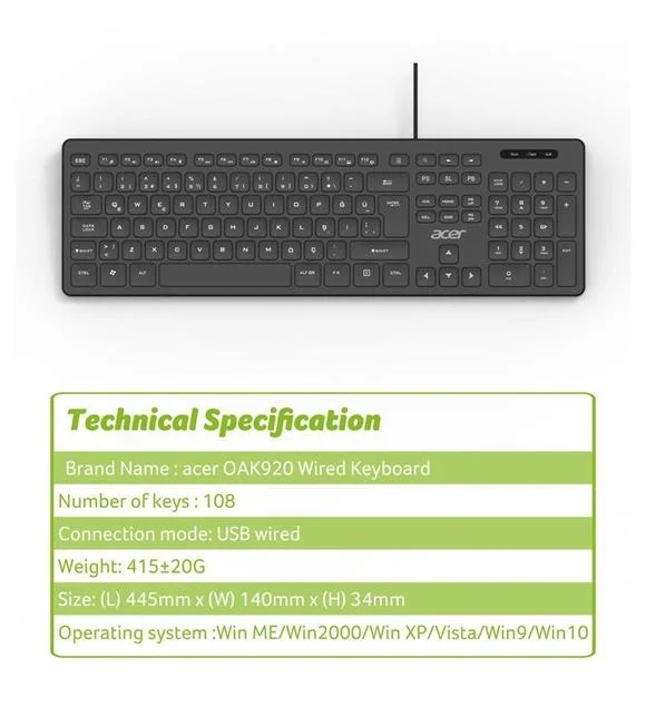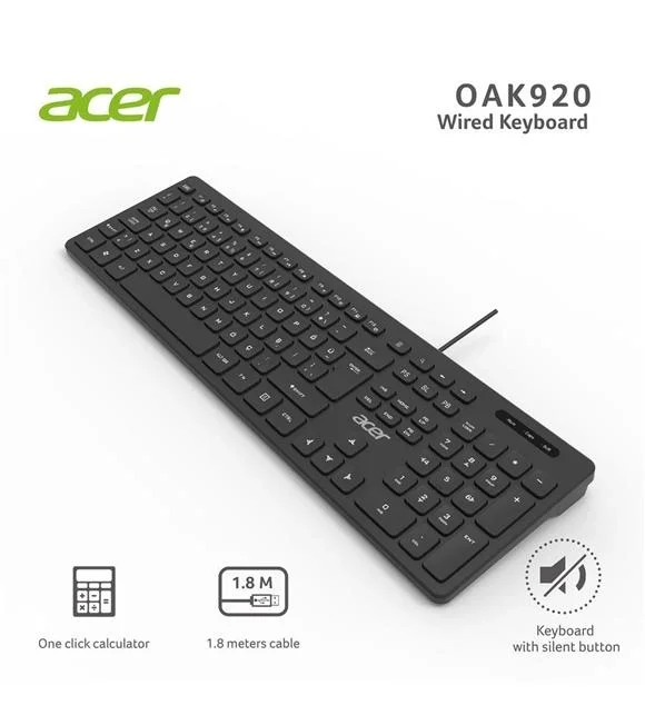 Acer OAK920, iş akışınızı hızlandıracak fonksiyonel detaylarla donatılmıştır. Klavyenin üzerinde yer alan özel Tek Tuş Hesap Makinesi butonu, karmaşık işlemlerinizde dijital hesap makinesine anında erişim sağlayarak zaman kazandırır. 1.8 metre uzunluğundaki USB kablosu, bilgisayar kasanız masanın altında olsa bile size geniş bir hareket alanı sunar; kablo gerginliği yaşatmadan klavyenizi dilediğiniz açıda konumlandırmanıza imkan tanır. Tak-çalıştır (Plug and Play) özelliği sayesinde Windows, macOS ve Linux sistemlerde sürücü kurulumu gerektirmeden anında kullanılabilir.