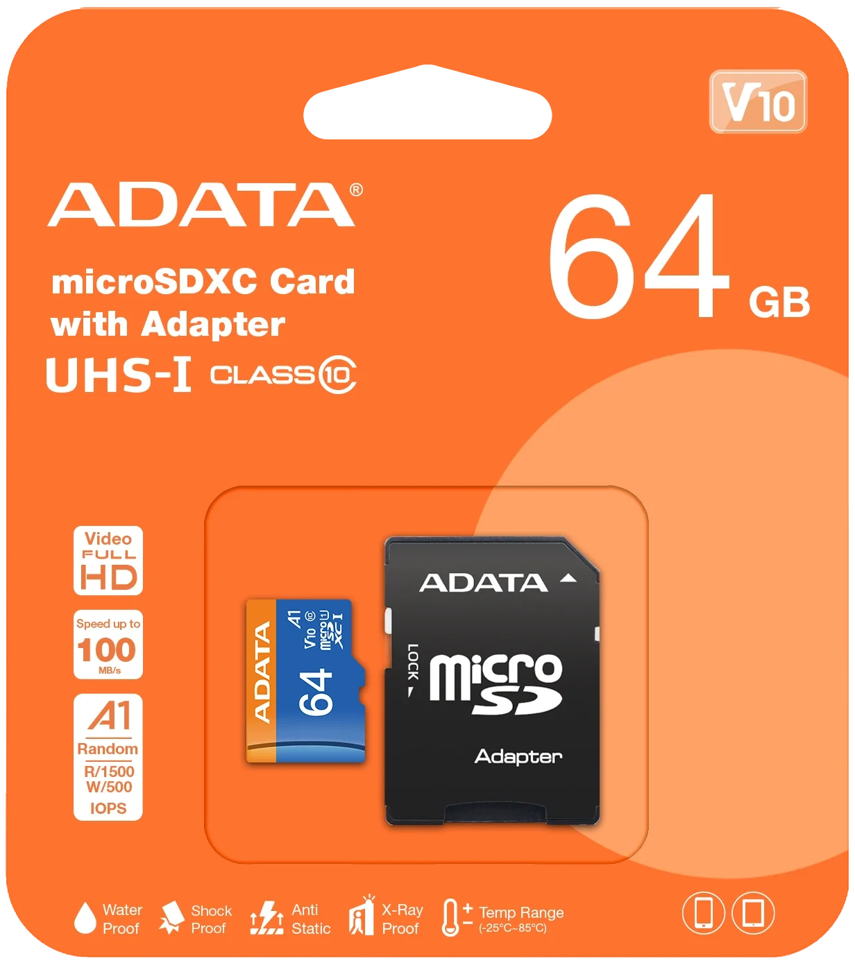 ADATA Premier microSDXC 64GB, günlük mobil kullanım ve standart video kayıt ihtiyaçları için dengeli bir performans sunar. Üretici verilerine göre bu hafıza kartı, UHS-I Class 10 ve V10 (Video Speed Class 10) standartlarını karşılayarak Full HD (1080p) videoların kesintisiz kaydedilmesini sağlar. 64GB kapasitesiyle binlerce fotoğraf ve saatlerce süren yüksek kaliteli videoyu tek bir kartta toplamanıza olanak tanır.