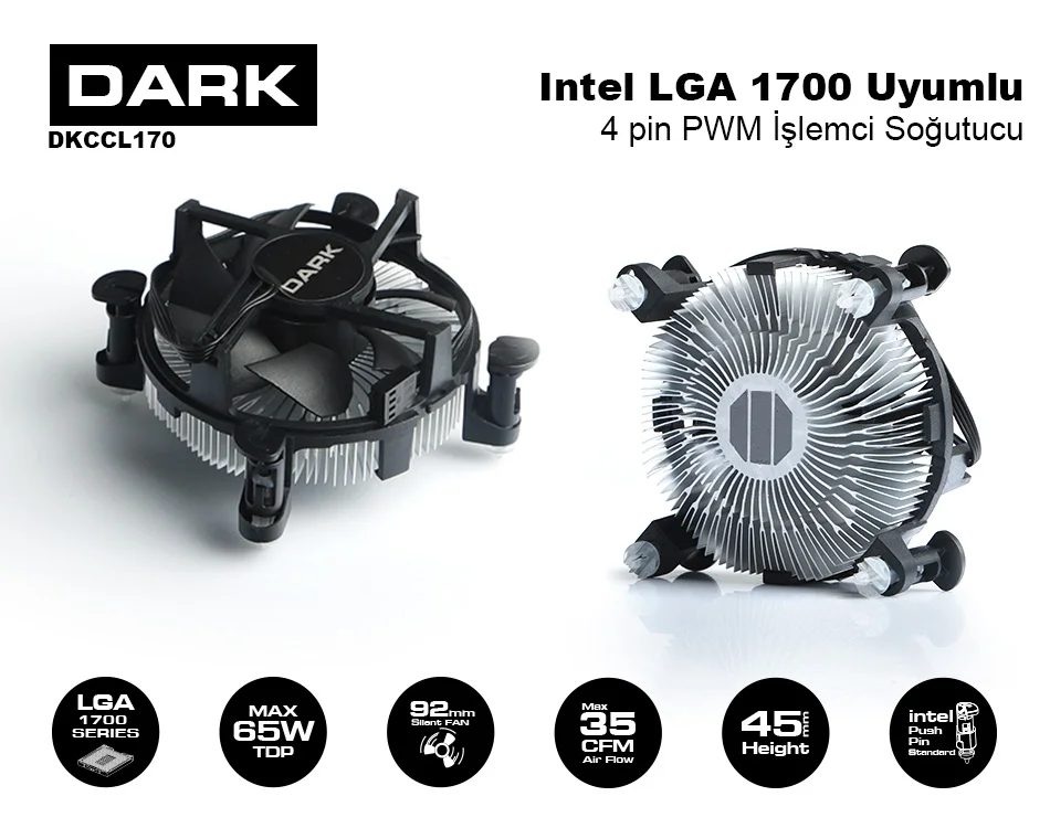Sistem sessizliği ve soğutma performansı arasındaki dengeyi kuran Dark DKCCL170, sahip olduğu 4-pin PWM bağlantısı sayesinde anakart üzerinden otomatik hız kontrolü sunar. İşlemci yüküne bağlı olarak fan devrini 2400 RPM seviyesine kadar dinamik olarak ayarlar. Bu sayede düşük yükte 22 dBA seviyesinde ultra sessiz bir deneyim sunarken, yüksek ısı oluşumunda 35 CFM hava akışı sağlayarak işlemcinizi güvenli sıcaklık değerlerinde tutar. Standart push-pin mekanizması, montaj sürecini aletsiz ve zahmetsiz bir hale getirir.