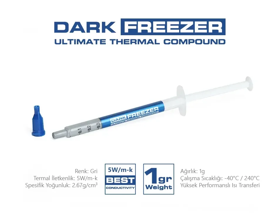 Dark Freezer Ultimate, sadece masaüstü bilgisayarlar için değil; ısınma sorununun kritik olduğu notebook’lar, anakart çipsetleri ve ekran kartları için de idealdir. -40°C ile 240°C arasındaki ekstrem çalışma sıcaklıklarına dayanıklı olan bu macun, en ağır yükler altında bile kararlılığını korur. 1 gramlık pratik şırınga tasarımı, hem profesyonel teknik servisler hem de kendi bakımını yapan son kullanıcılar için donanımlı ve ekonomik bir kullanım sunar.