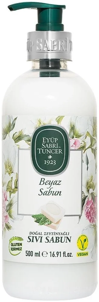 Eyüp Sabri Tuncer Beyaz Sabun Kokulu Sıvı Sabun, nesillerdir vazgeçilemeyen beyaz sabun ferahlığını sıvı sabun kullanım kolaylığıyla sunuyor. %100 doğal zeytinyağı içeren formülü, cildin doğal dengesini korumaya yardımcı olurken ellerinizi yumuşatır ve kusursuz bir temizlik hissi bırakır.