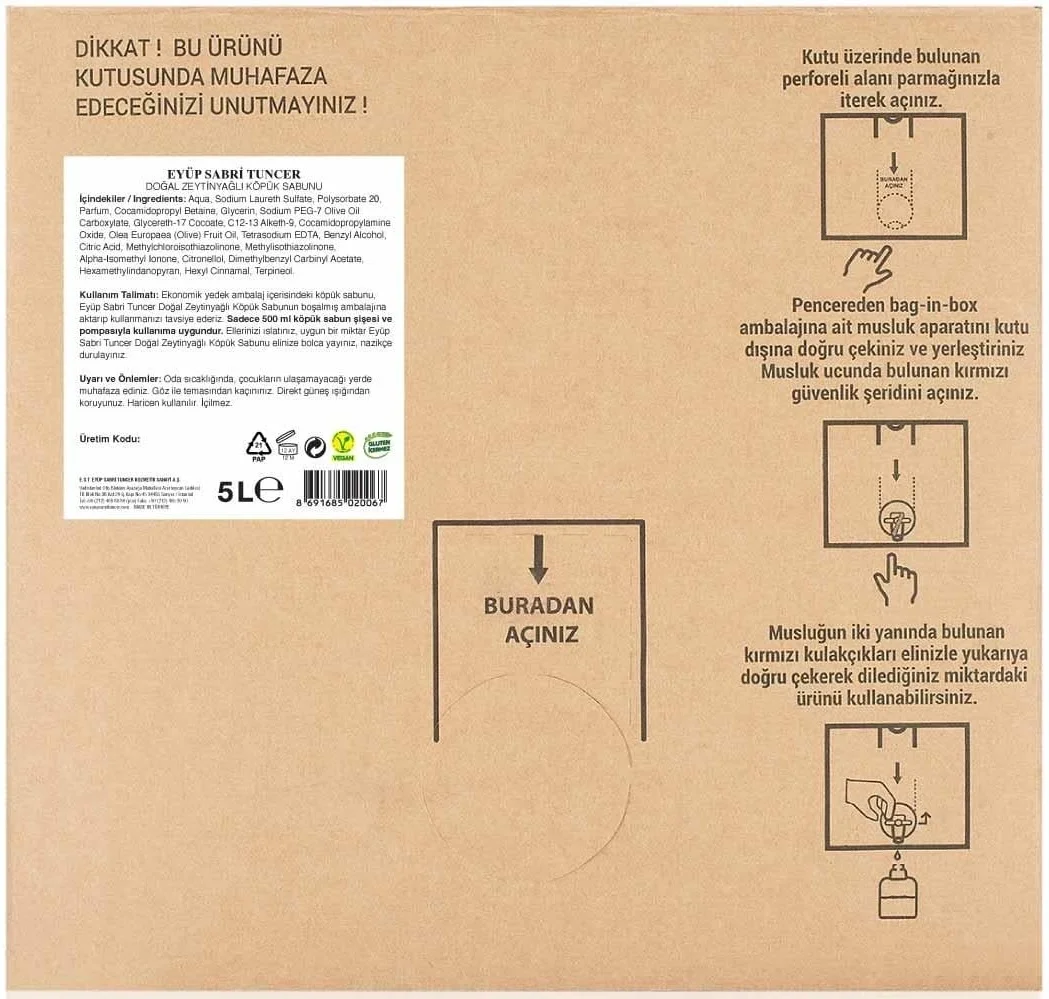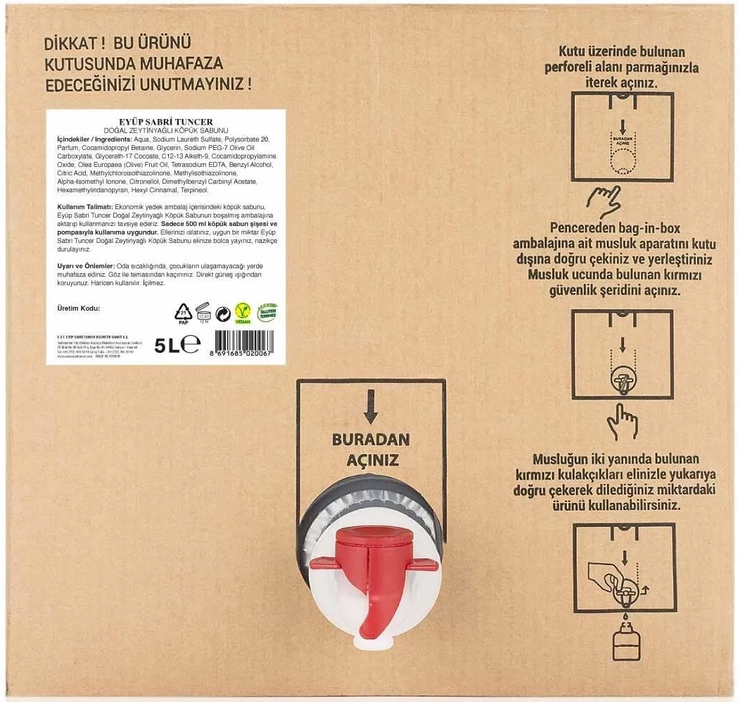 Yoğun insan trafiğinin olduğu ofisler, restoranlar, oteller ve fabrikalar için tasarlanan Eyüp Sabri Tuncer Doğal Zeytinyağlı Köpük Sabun 5 LT, hijyeni dev boyutlarda sunar. Yenilikçi Bag-in-Box (kutuda torba) teknolojisi ile sunulan bu ürün, hava ile temas etmeyen vakumlu yapısı sayesinde sabunun tazeliğini ve kokusunu son damlasına kadar korur. %100 doğal zeytinyağı içeriğiyle personelinize ve misafirlerinize sadece temizlik değil, aynı zamanda cildi besleyen bir el bakım deneyimi sağlar.