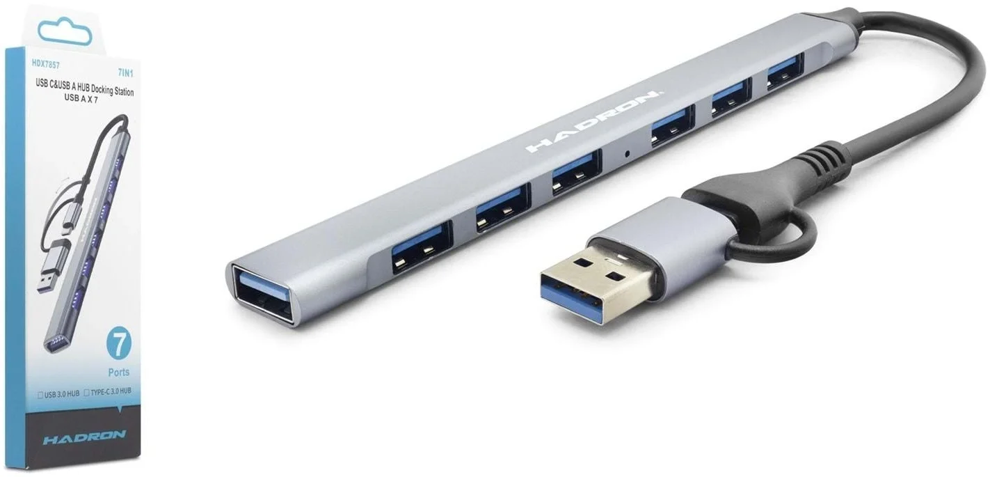 Hadron HDX7857, port çeşitliliği ile hız gereksinimlerini mükemmel bir dengede sunar. Üzerinde yer alan mavi renkli USB 3.0 portu, harici diskler ve yüksek kapasiteli bellekler için 5 Gbps’e varan veri transfer hızı sağlar. Geriye kalan 6 adet USB 2.0 portu ise klavye, mouse, yazıcı, web kamerası ve USB kulaklık gibi sürekli bağlı kalması gereken aksesuarlarınız için ayrılmıştır. Hibrit ucu sayesinde cihazlar arasında geçiş yaparken ek dönüştürücü arama derdini ortadan kaldıran bu hub, tak-çalıştır mimarisiyle kurulum gerektirmeden tam performans sergiler.
