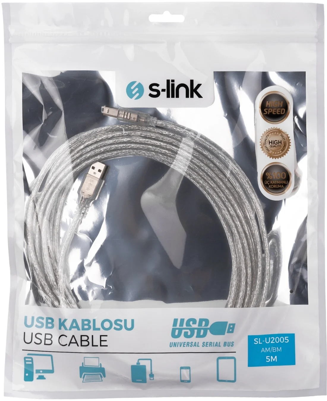 USB Type A Erkek ve USB Type B Erkek uçları sayesinde piyasadaki HP, Canon, Epson, Brother ve Xerox gibi tüm lider yazıcı markalarıyla %100 uyumlu çalışır. 134 gramlık ağırlığıyla dayanıklı bir malzeme yapısına sahip olduğunu hissettiren SL-U2005, uzun mesafelerde oluşabilecek sinyal parazitlerini minimize eden yalıtım katmanlarına sahiptir. Tak-çalıştır (Plug and Play) mimarisi, ürünü kutusundan çıkardığınız anda kullanıma hazır hale getirir.